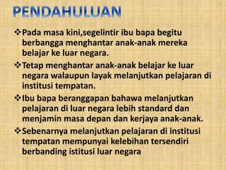 Kelebihan belajar di universiti tempatan. Peluang untuk Belajar Bahasa Rusia. Baiklah mari kita teruskan diskusi ini dengan mengkaji beberapa kelebihan menyambung pengajian di dalam negara. 2Pengajian adalah dalam BAHASA INGGERISBahasa arab hanya perlu untuk bermuamalat dengan masyarakat tempatan.